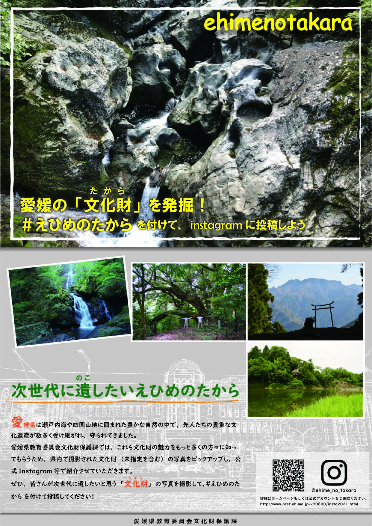 また、愛媛県内で撮影された文化財(未指定含む)の写真をピックアップし、当課インスタグラムやホームページ、イベント等にて紹介させていただきます。ぜひ、皆さんが次世代に遺したいと思う愛媛の文化財の写真を撮影して、インスタグラムにハッシュタグ「#えひめのたから」を付けて投稿してください。