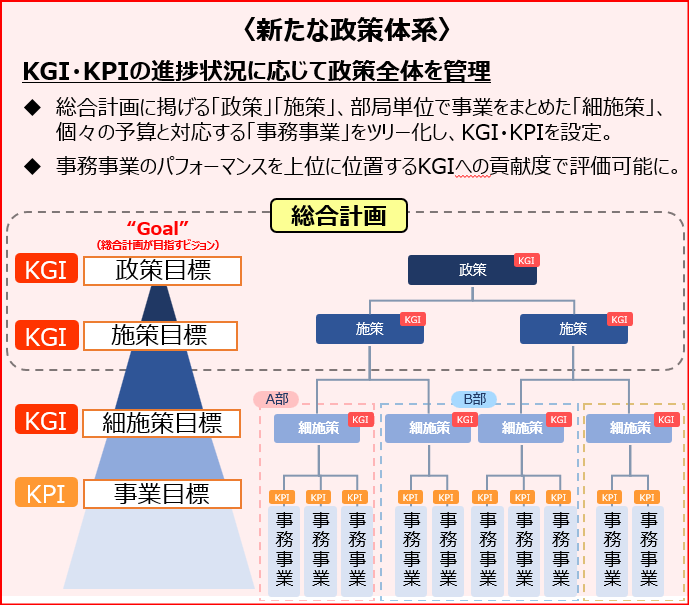令和5年度評価から、従来の行政評価システムをKPIマネジメントへ発展的に見直し、年間を通してKGI、KPIによる事業管理・評価に取り組むこととしました。