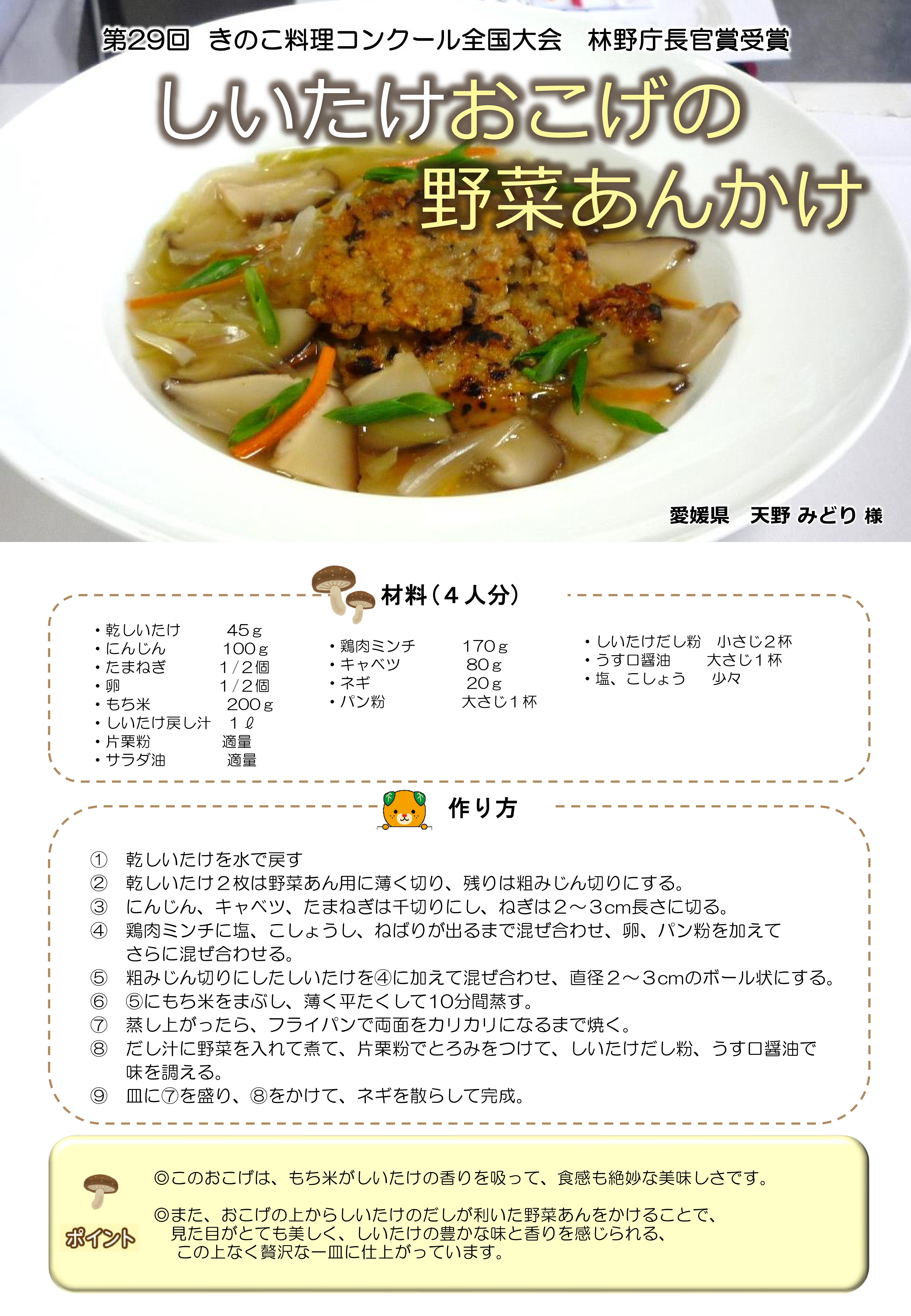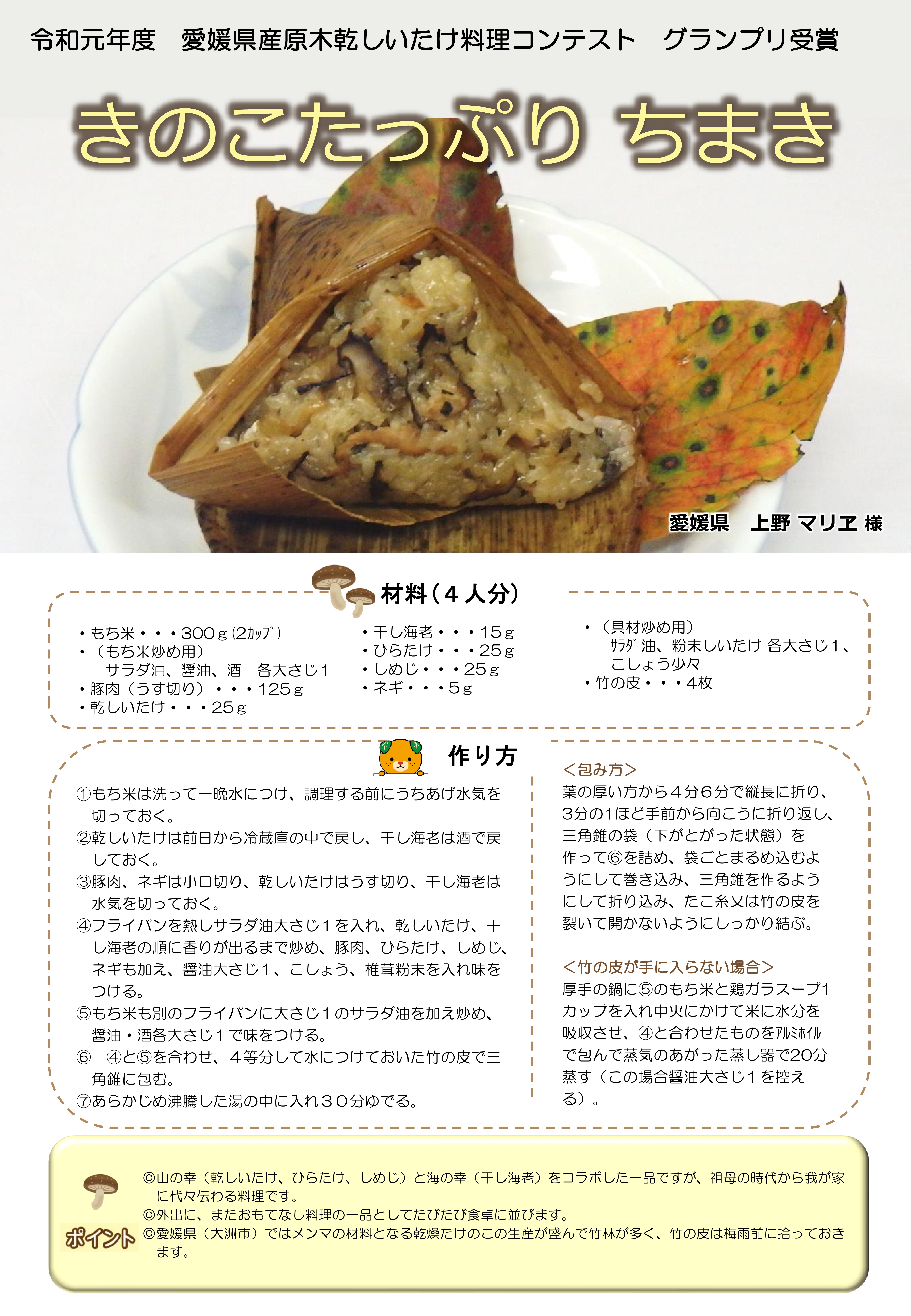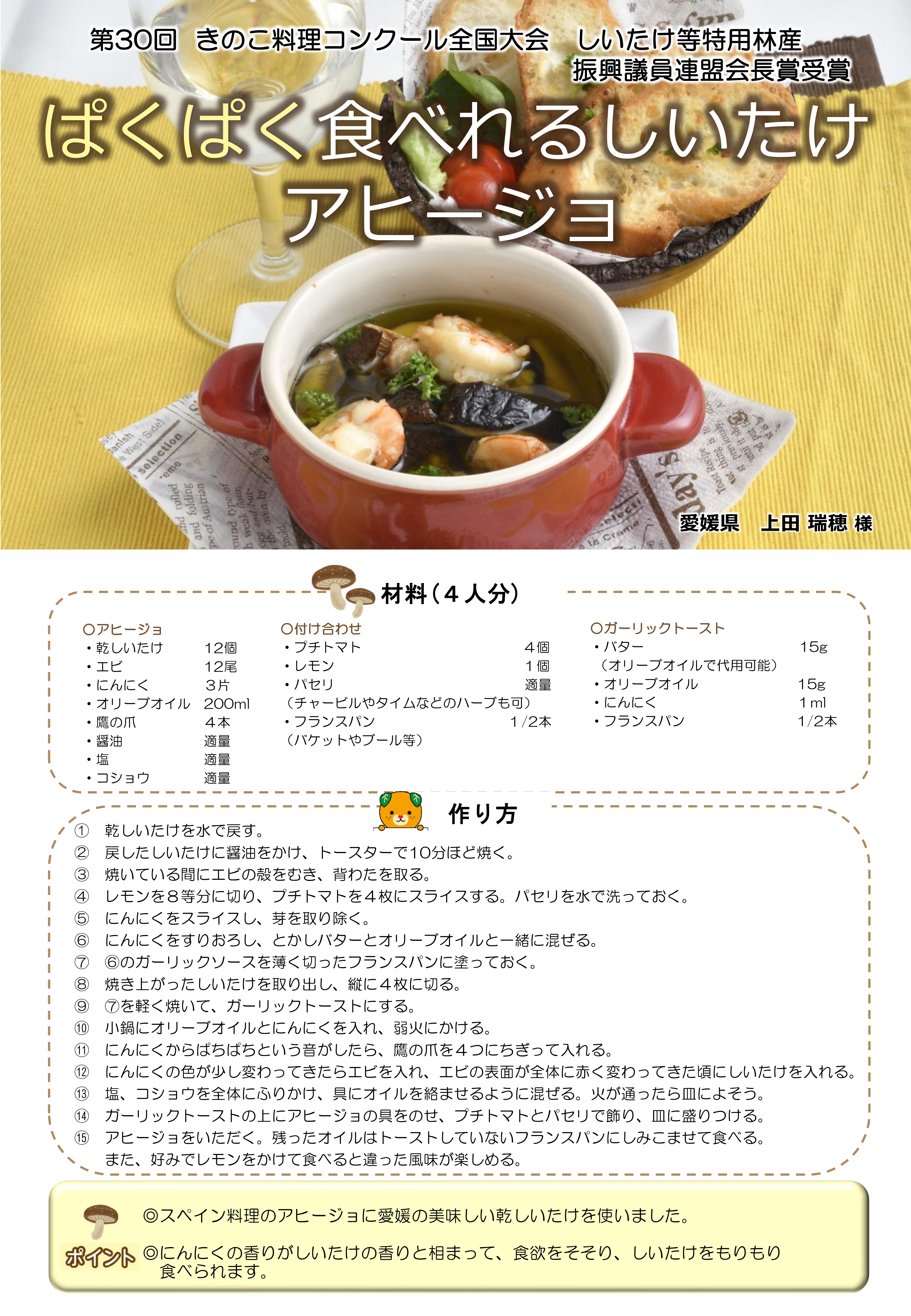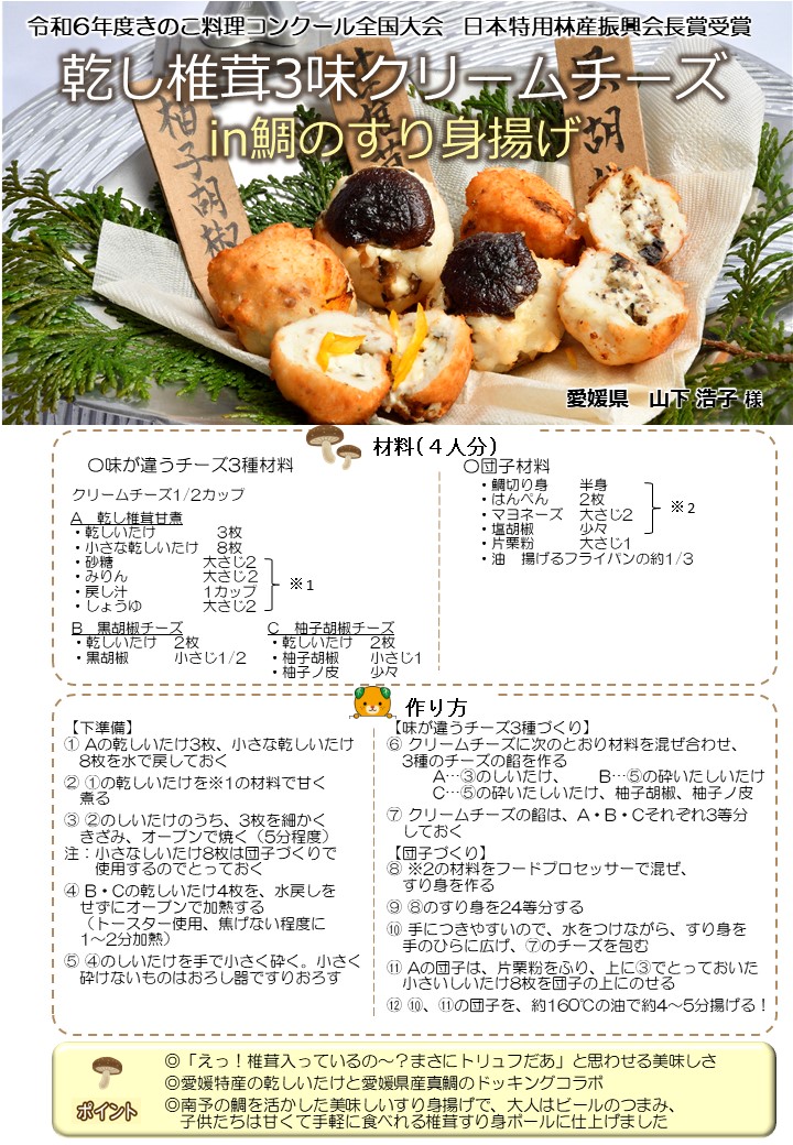 毎年開催される、「愛媛県産原木乾しいたけ料理コンテスト」でグランプリを獲得し、