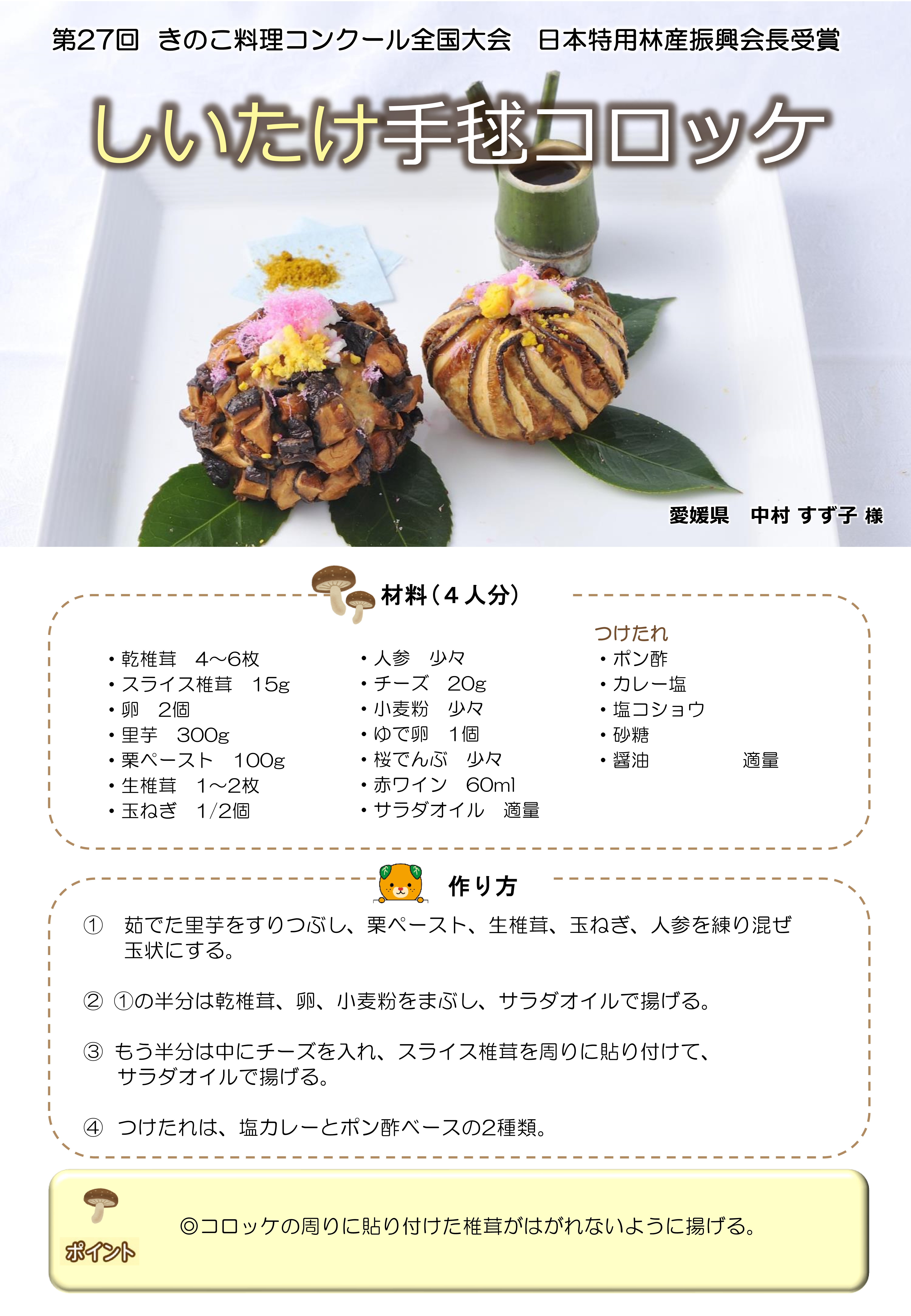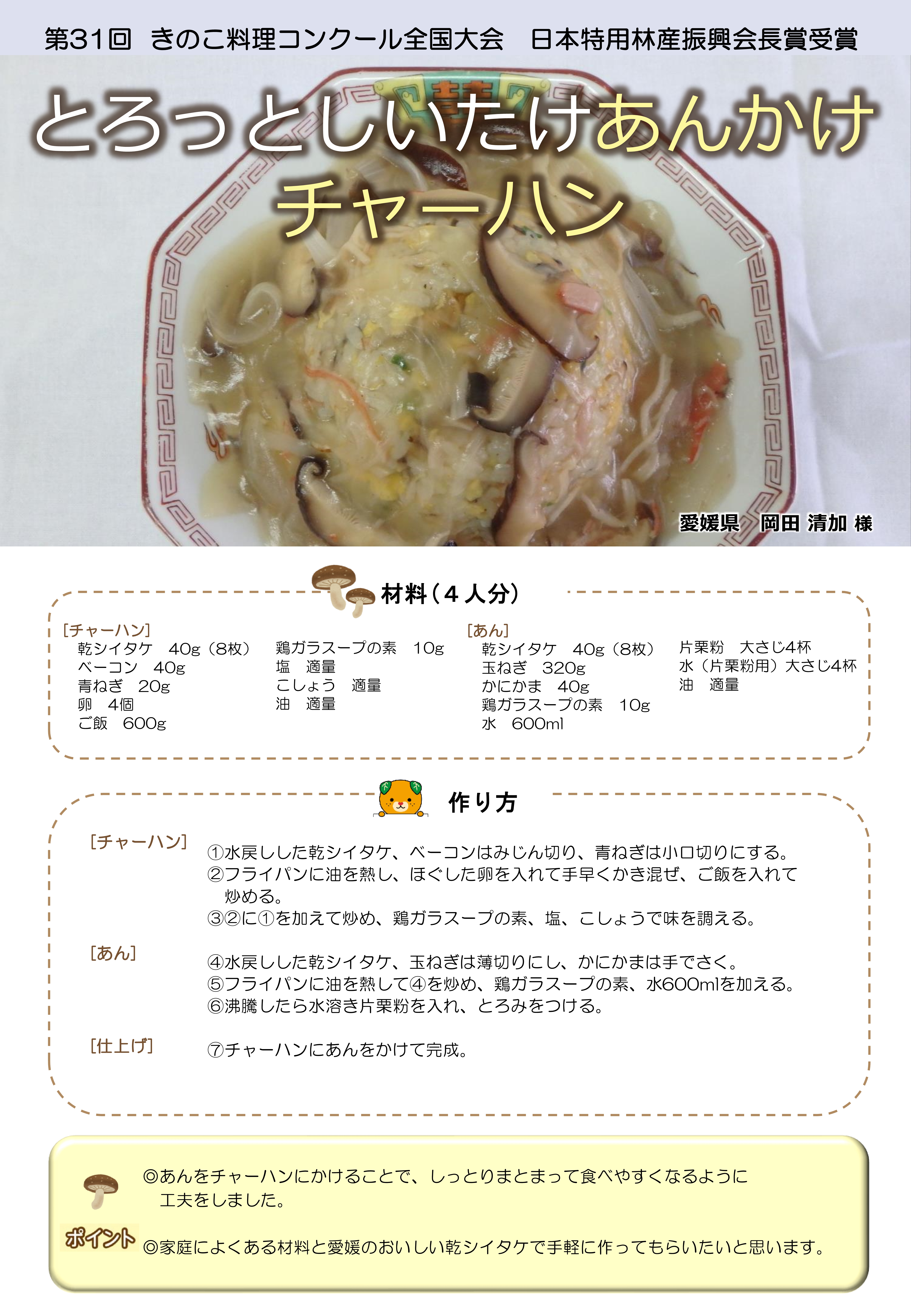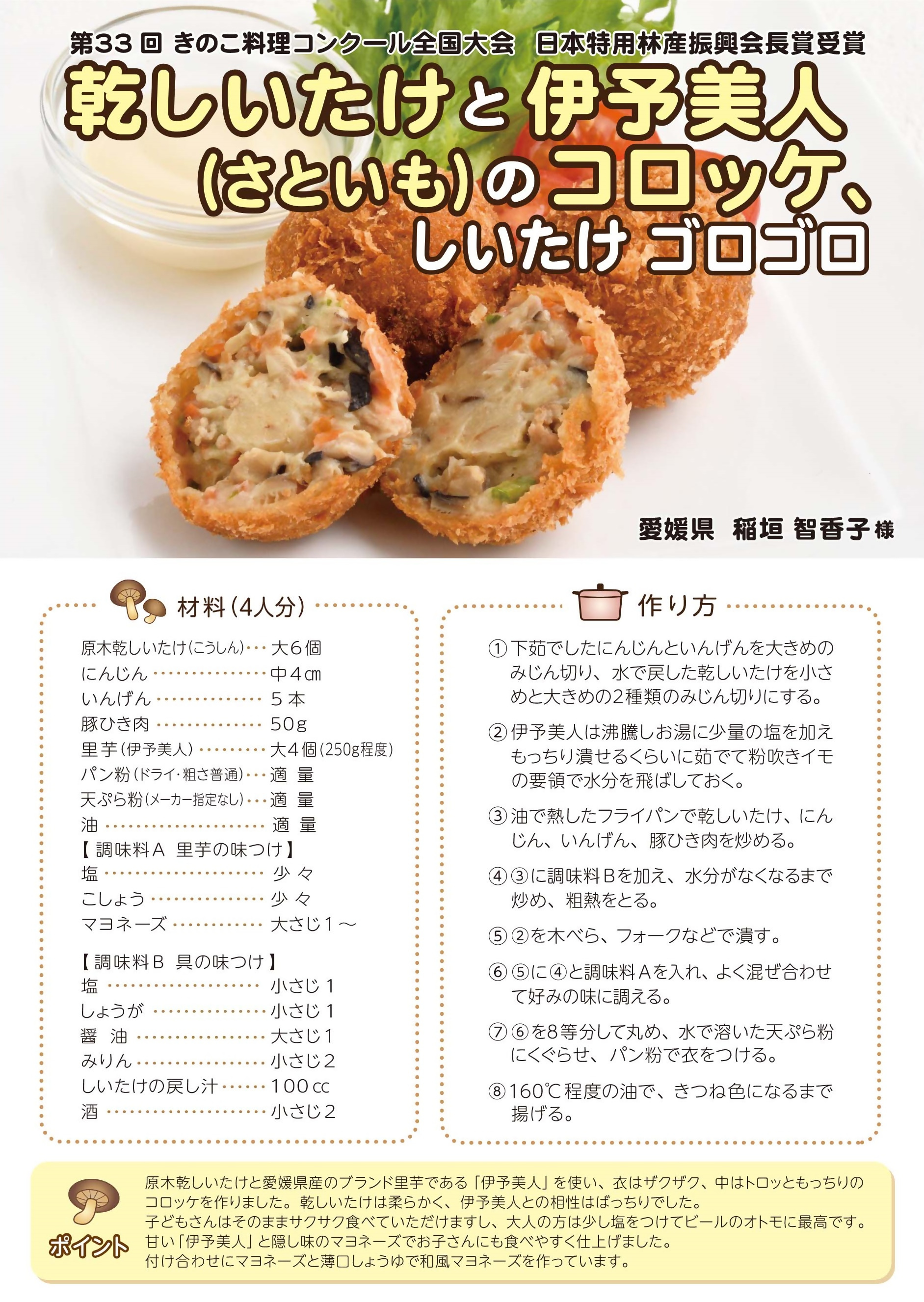毎年開催される、「愛媛県産原木乾しいたけ料理コンテスト」でグランプリを獲得し、
