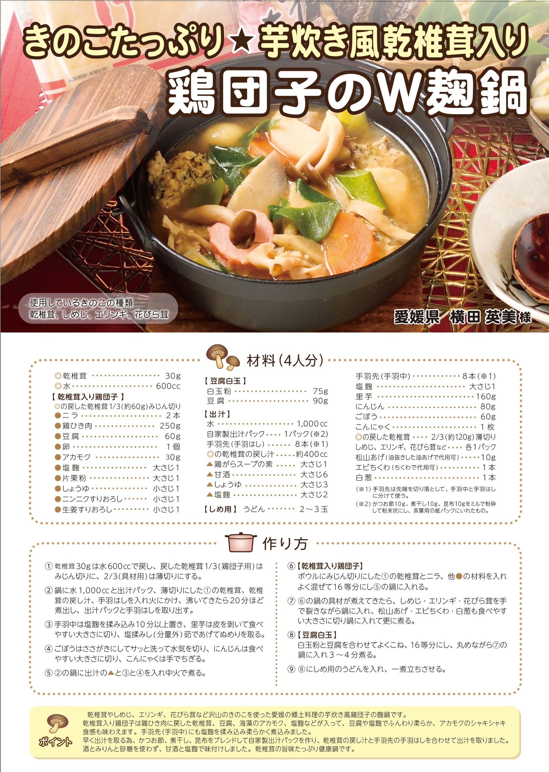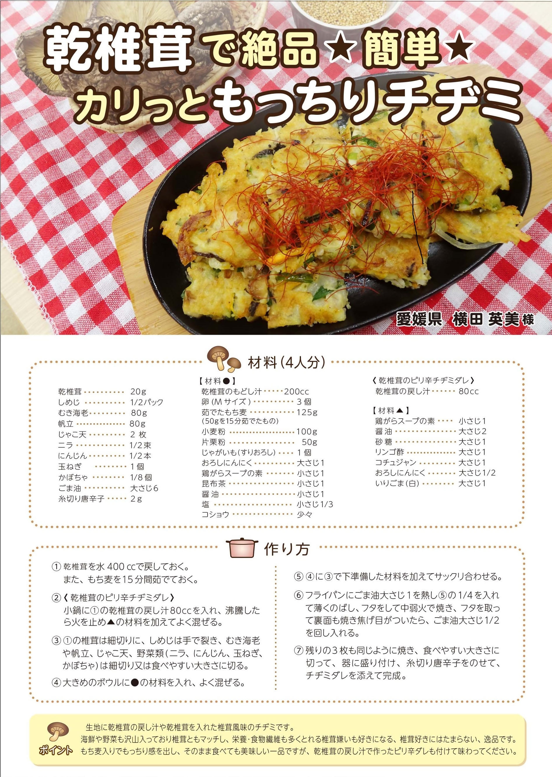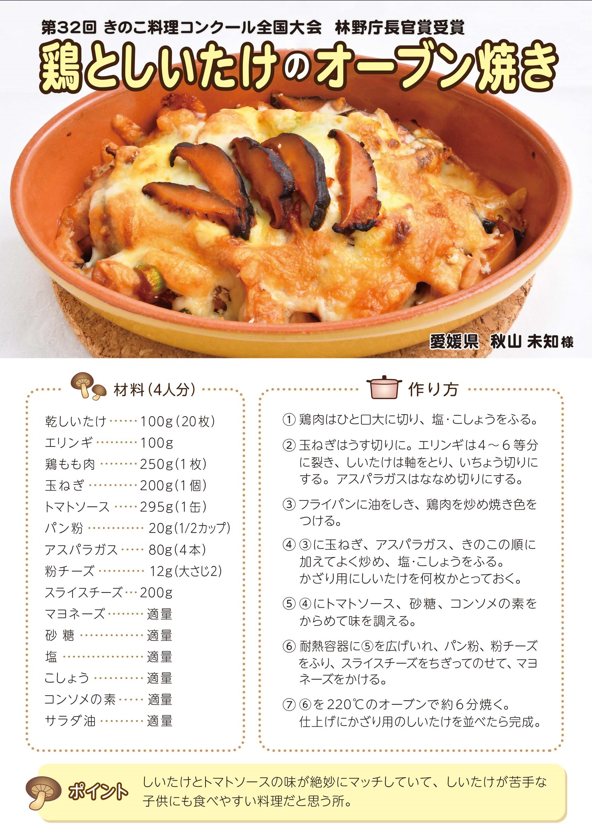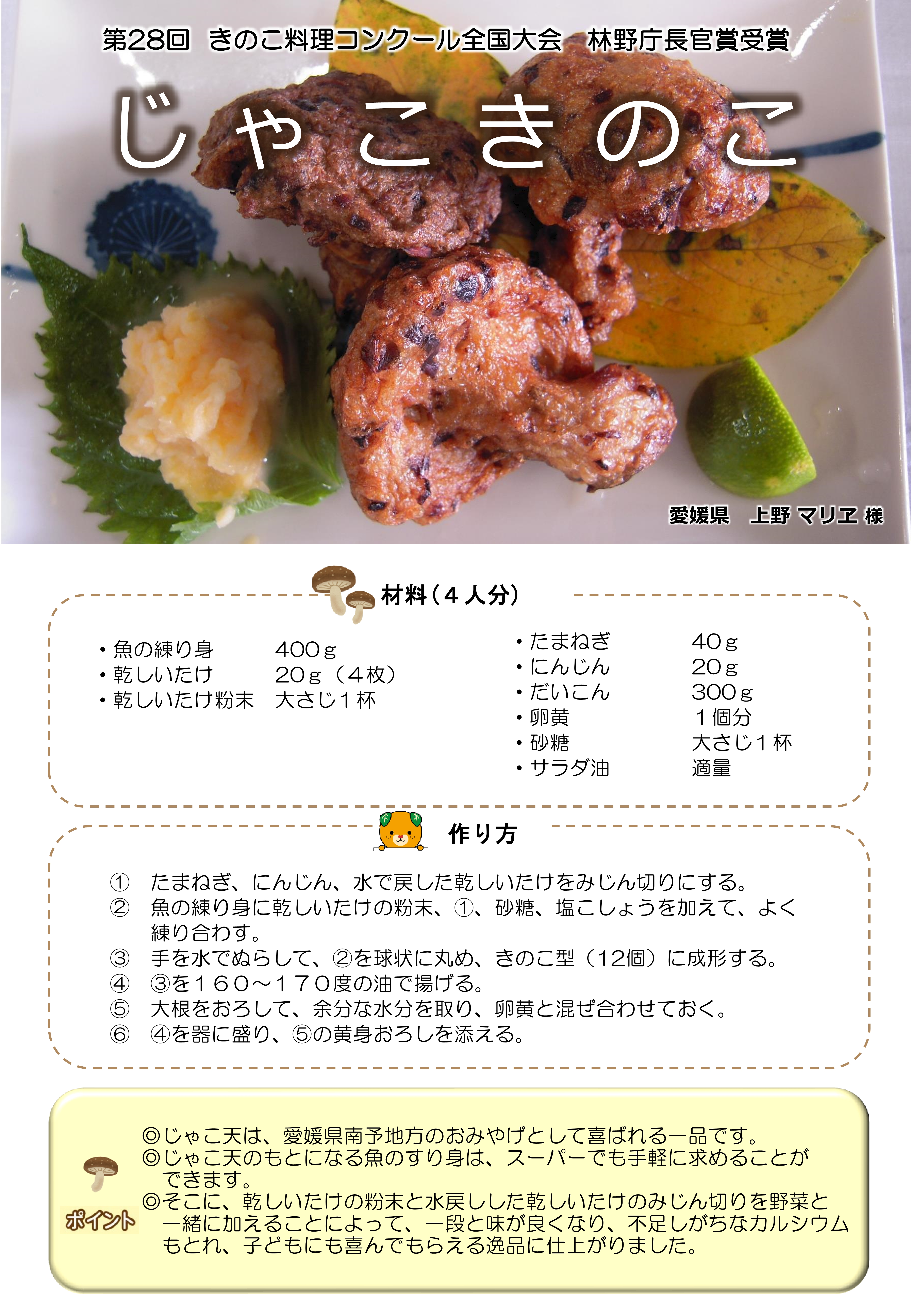 毎年開催される、「愛媛県産原木乾しいたけ料理コンテスト」でグランプリを獲得し、